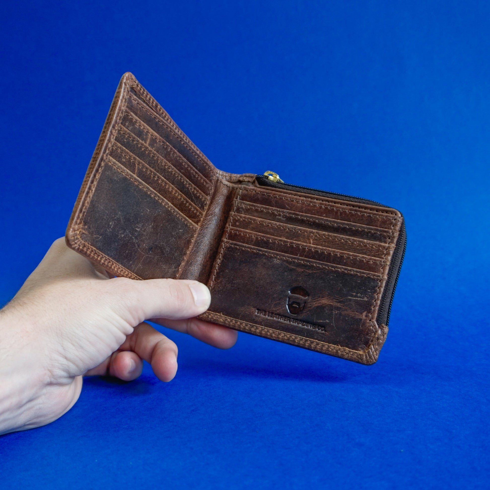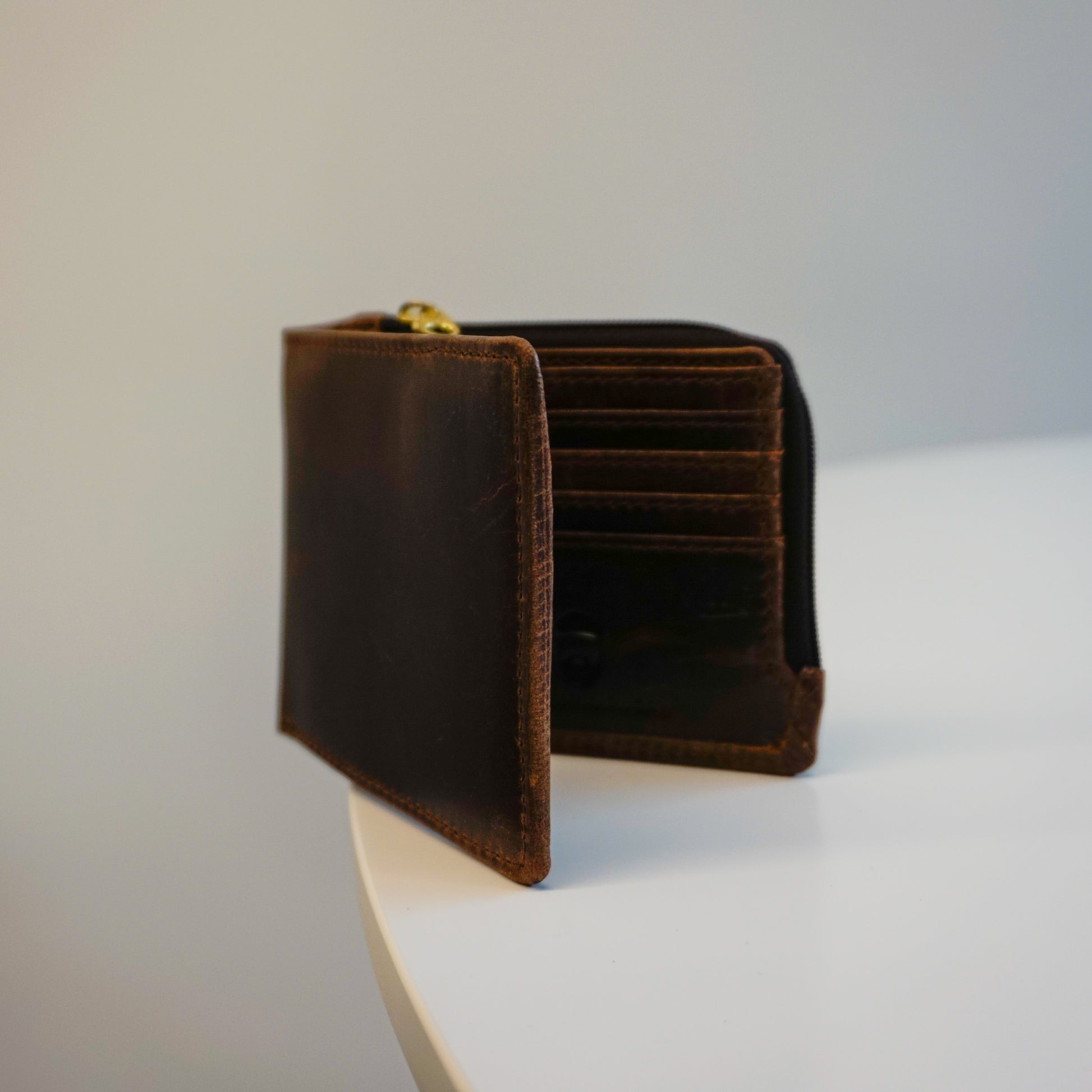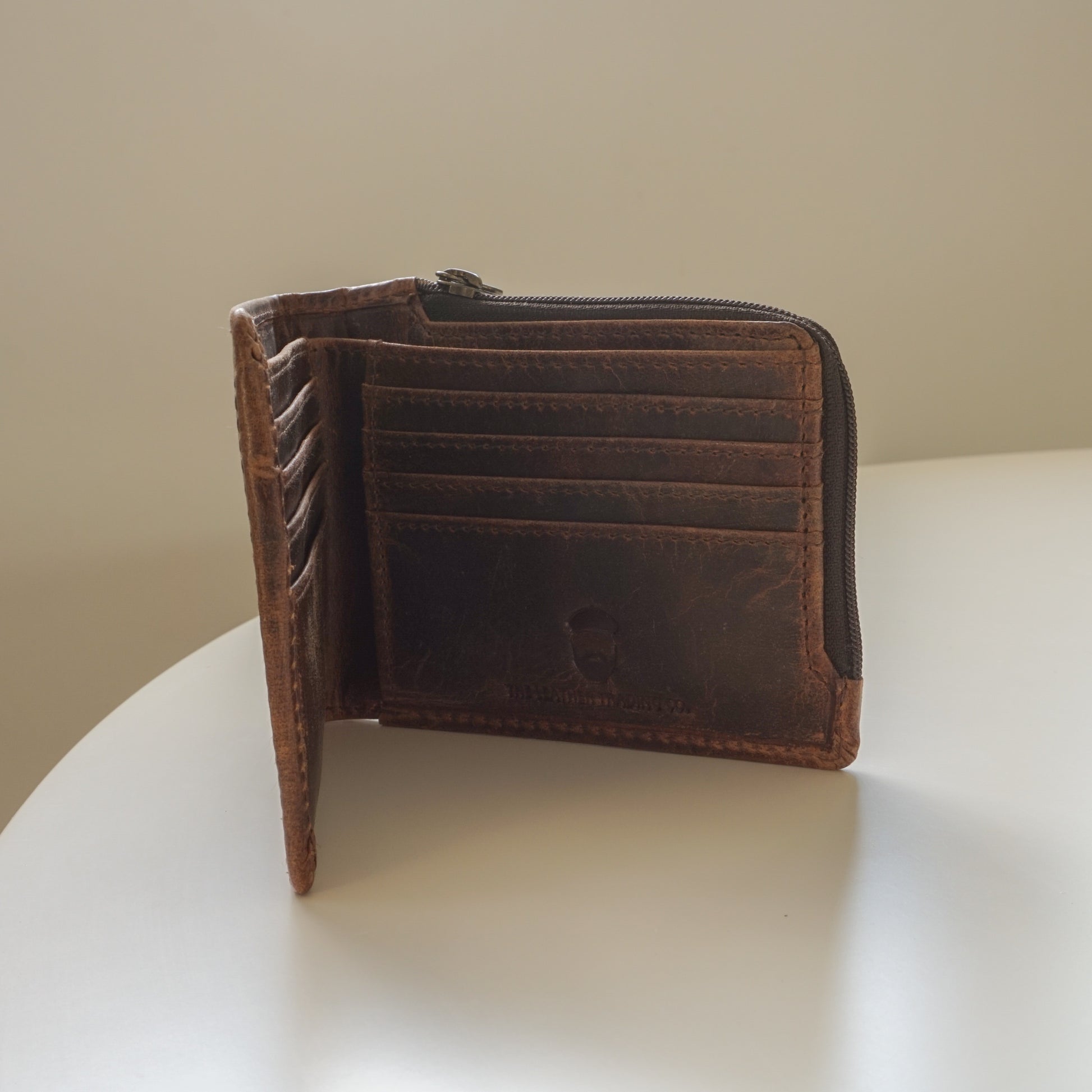 There are two bill compartments on the wallet, with a partition in the middle. Card slots also available, 8 in total, elongated. Two further compartments, one on the left and the other on the right, slightly more spacious than the card compartments, are also present. The wallet is also equipped with a coin compartment, with a zipper on the corner.