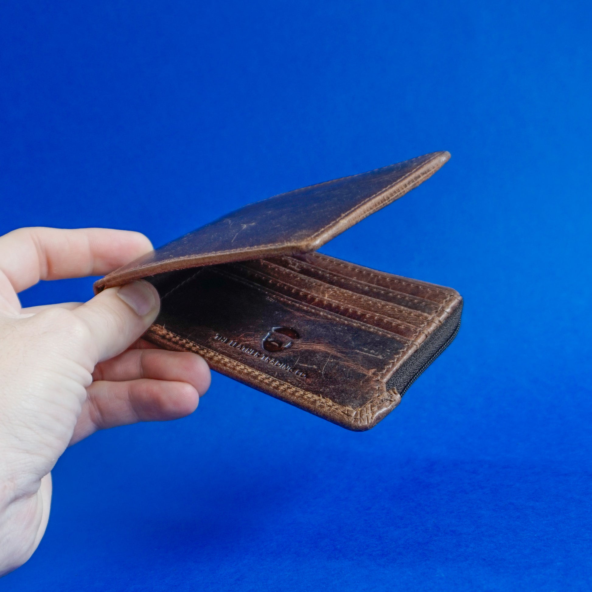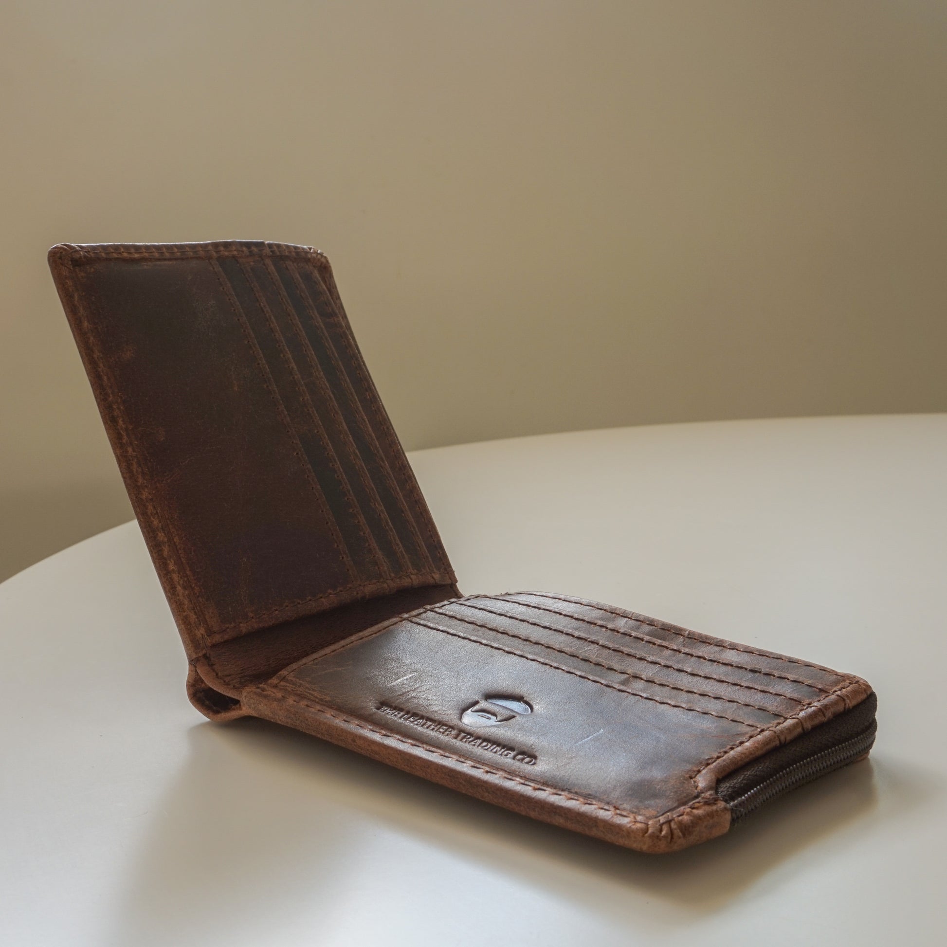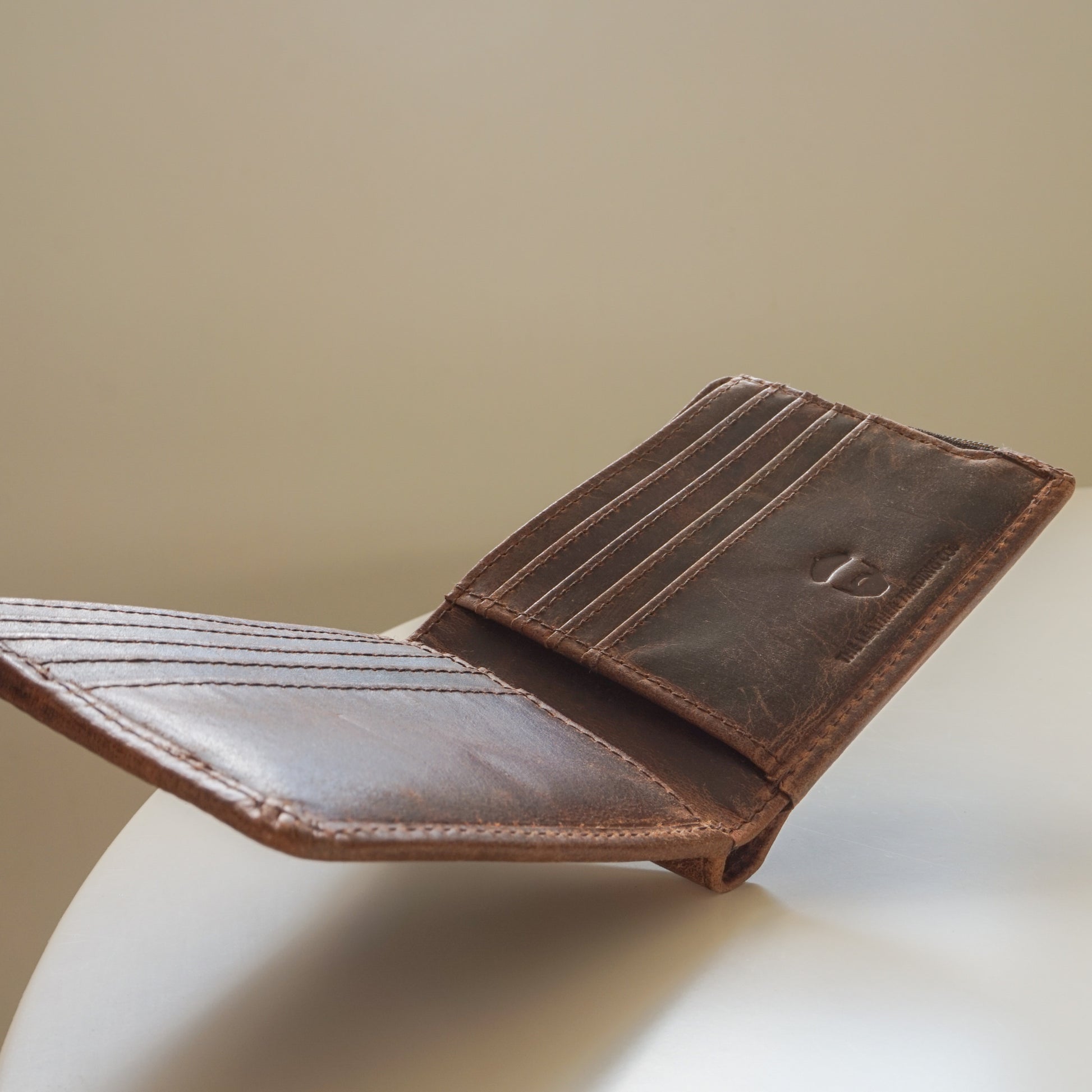 There are two bill compartments on the wallet, with a partition in the middle. Card slots also available, 8 in total, elongated. Two further compartments, one on the left and the other on the right, slightly more spacious than the card compartments, are also present. The wallet is also equipped with a coin compartment, with a zipper on the corner.