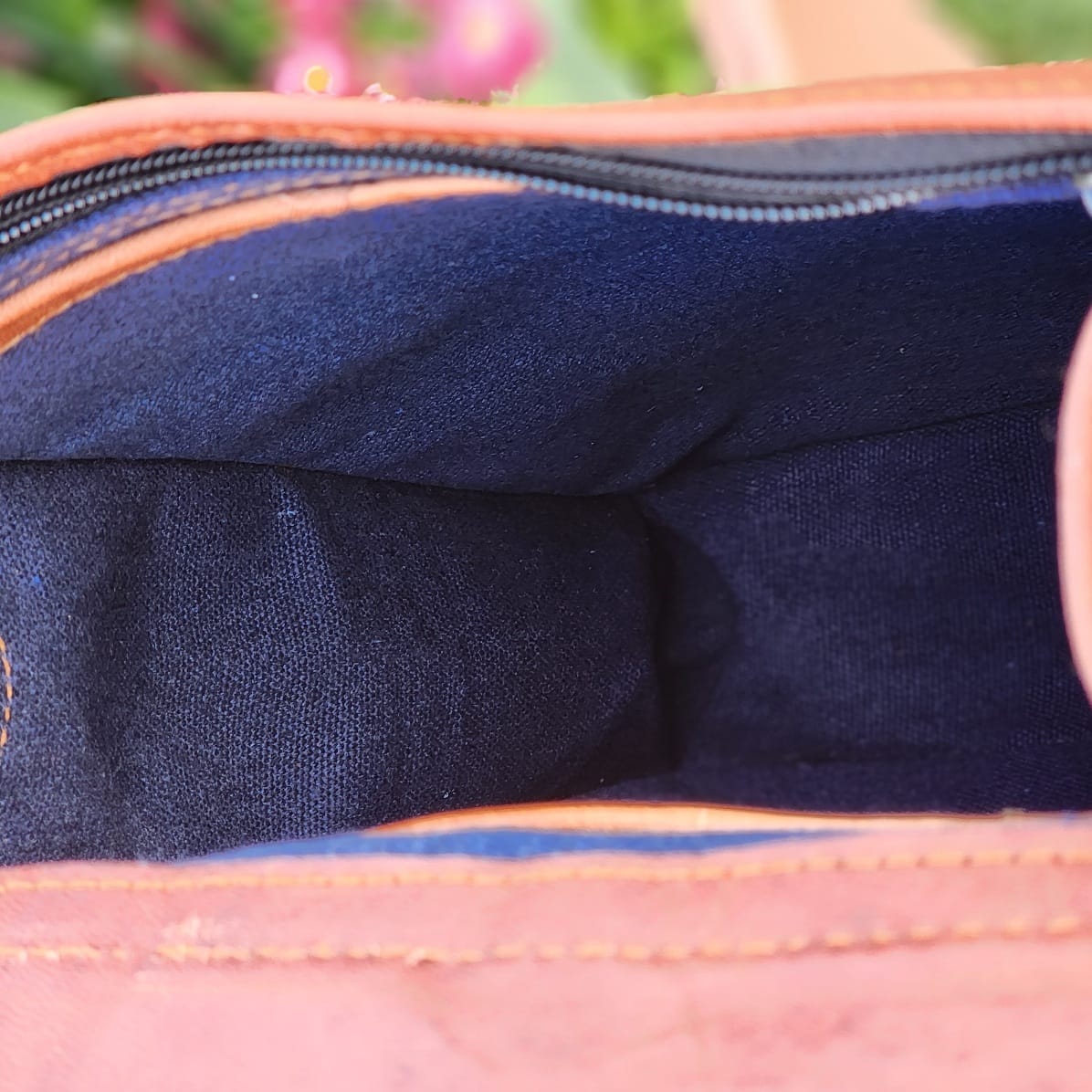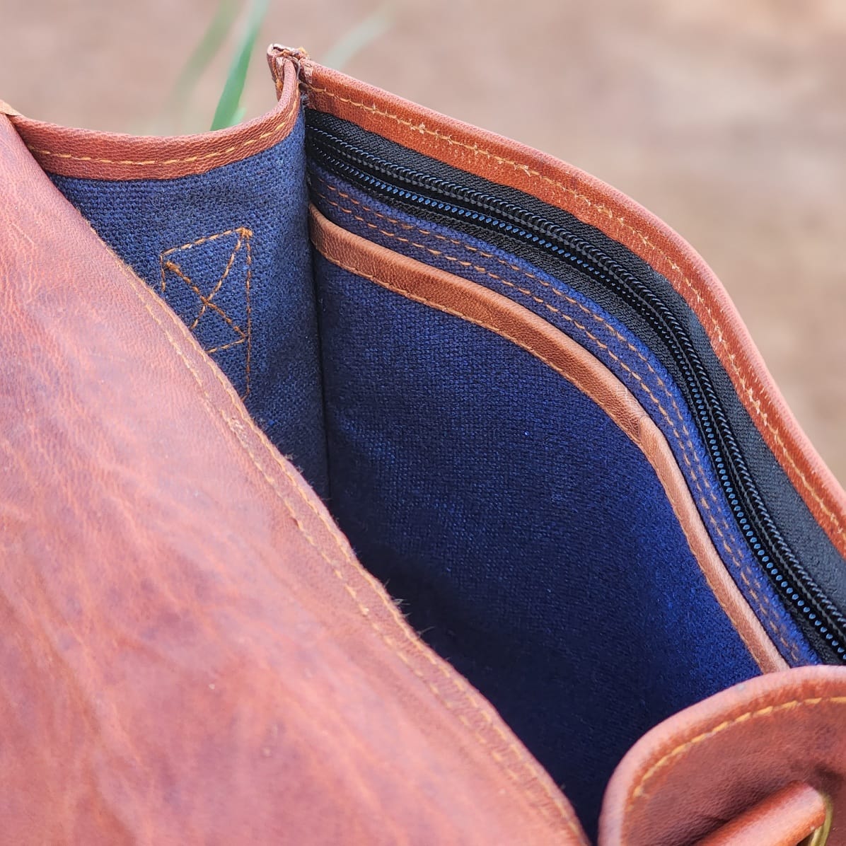 Its canvas-lined interior features a rear zip pocket, front slip pocket, dual internal slips, a central compartment, and a secure inner zip.